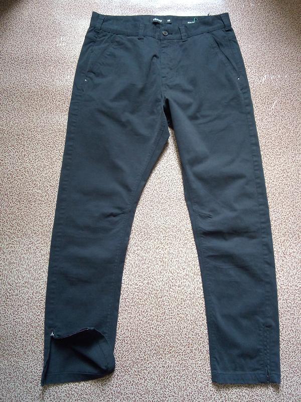 Штаны цвета асфальта тёмные, легкие, коттон и эластан, приятны на ощупь. Талия 86 см. Бедра 112 см. Длина внешнего шва 106 см. Низ 16 см, на молнии сбоку . Шаг 76 см. Посадка спереди 29 см. Ширина штанины сверху 33 см.