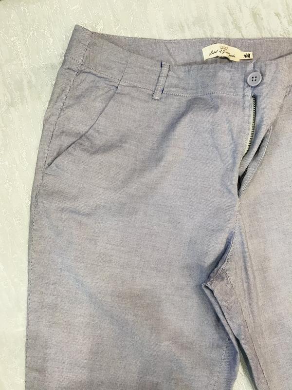 Голубые в белую полоску стрейчевые летние брюки с карманами H&M Бирка срезана , носили на размер 46/48 , смотрите замеры Длина по внешнему шву 102 см, шаговый 74 см, посадка сзади 41 см, спереди 28 см, ПОТ 47 см, ПОБ 60-69 см тянется, полуобхват колоши сверху 35-38 см, снизу 18 см. Состояние новых ,дефектов нет