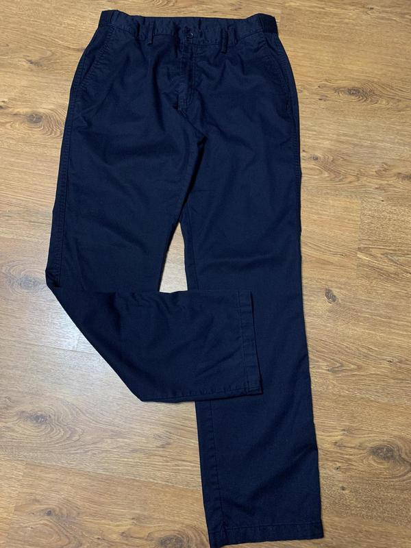 стан ідеальний темно синього кольору тканинні не щільні не тягнуться до низу трохи завужені застегуется на блискавку і гудзика є дві кишені і дві кишені ззаду по лінії талії є вставки гумки приховані склад 65% поліестер 35% Катон виміри піт 44+ побіди 55 довжина ,104 низ по 19