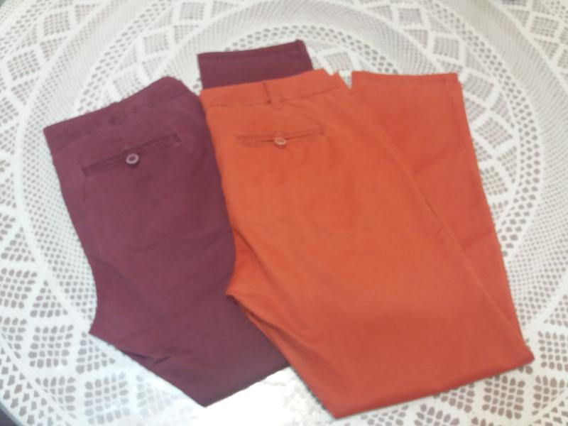 штани. штани 98% бавовна, 2% еластан, підкладка кишені 100% бавовна Дві косі кишені спереду і дві ззаду на гудзикахВідмінна основа для безлічі стилів. оранж -399грн у відмінному стані.Пояс - 46.5 см, стегна - 56см, довжина кроку - 72см, ширина штанки вгорі/внизу - 31/17,5 см, посадка - 23/37см, тягнуться помірно. бордо - 299грн. у хорошому стані Пояс - 46см, стегна - 54см, довжина кроку - 71 см, ширина штанки вгорі/внизу - 31/18см, посадка - 23/37см, тягнуться помірно.
