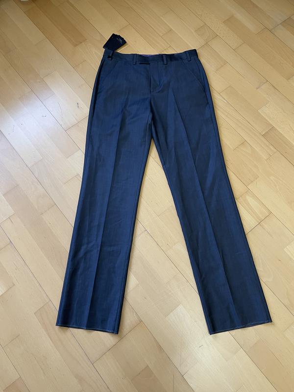 Классические мужские брюки из тончайшей шерсти 84 %, мохера 16%, темно - серого цвета, размера 32. Португалия, бренд Ted Baker. Пояс 42 см, ПОБ 54 см, длина 111 см ( край не подогнут), ширина в области бёдра 29 см, внизу 22 см. С этикеткой, ценником 75 фунтов ( первая цена). Легкий запах секонд - хенда.