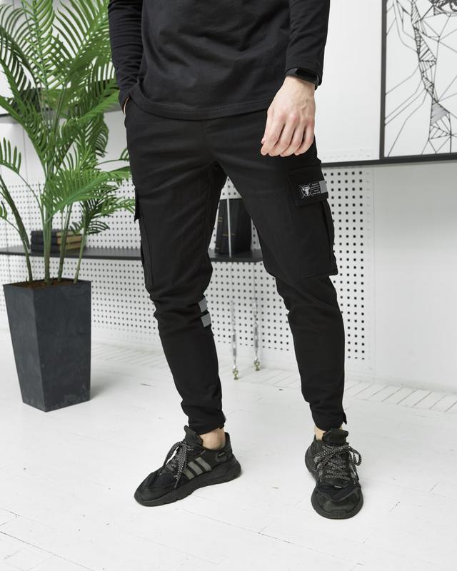 Штани Райот - Розміри: S, M, L, XL, XXL - Колір чорний - Матеріал: бавовна 100% - Крій завужений, знизу манжет на ліпучці з рефлективом - Ліпучки з рефлективом нижче коліна - В поясі резинка і шнурок для регулювання Кармани: - основні косі спереду - накладні кармани в області коліна - накладні кармани позаду