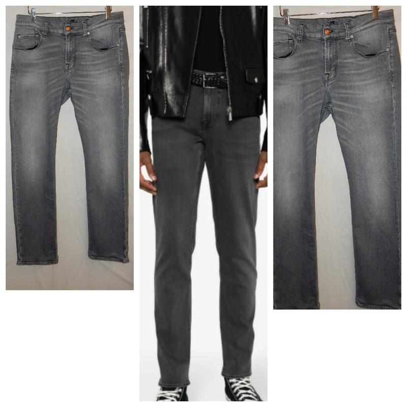 7 For All Mankind зауженные джинсы модель Slimmy Серый, эластичный хлопок, декоративные складки, эффект потертости, нашивка с логотипом сзади, средняя посадка, петли для ремня, застежка на молнии и пуговице спереди, зауженный крой и пять карманов. Цвет: Grey серый Декор: потёртости Модель: Slimmy Состав: 98% хлопок, 2% эластан Размер 33 на 48 плотный-50 Так как ткань очень эластичная, джинсы отлично тянутся и за счёт этого отлично садятся по фигуре Замеры: пояс ПОТ 43-47 (тянутся до 47) см, бёдра ПОБ 52 см и тянутся, посадка 28 см, длина по шву 108 см, внутренний шов 82 см, низ брючины 19 см