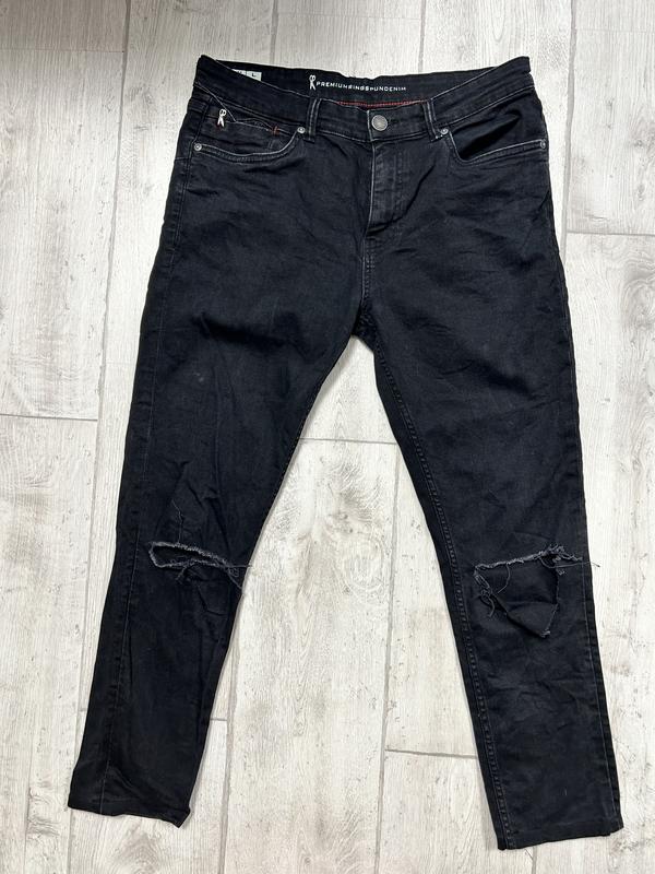 Джинсы с рваными коленями, одно чуть больше разрывное, оригинал, хорошее качество покупали за 1800 грн. Пояс 44-51, бедра 54-64, длина по внешнему шву 95, внутренний 66