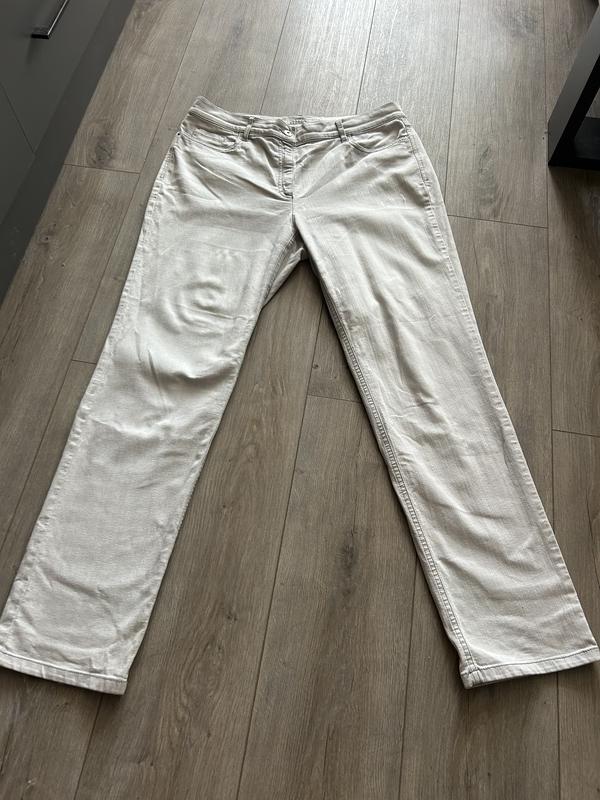 Сток состояния новых цвет бело-беж приближены к сероватому Длина-109 см Шагова-80 см Полу обхват бедер-57см тянется Полу обхват талии- 44 к 54 см тянется Ширина халоши на выходе снизу полхват- 20 см тянется