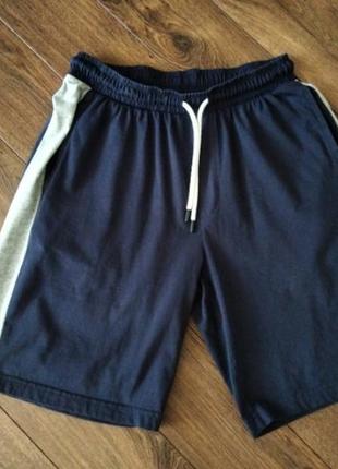 Комфортные трикотажные шорты с контрастной серой вставкой, боковые карманы открыты. Размер М. Длина 54 см, пот 38 см в спокойном состоянии, пос 58 см, низ штанины 33 см.