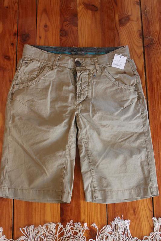 Котонові шорти кольору хакі розмір 30 вказано.Довжина по зовнішньому шву - 56см, внутрішня - 29см, пояс - 41см, поб - 54см, передня посадка - 29см, задня - 38см.