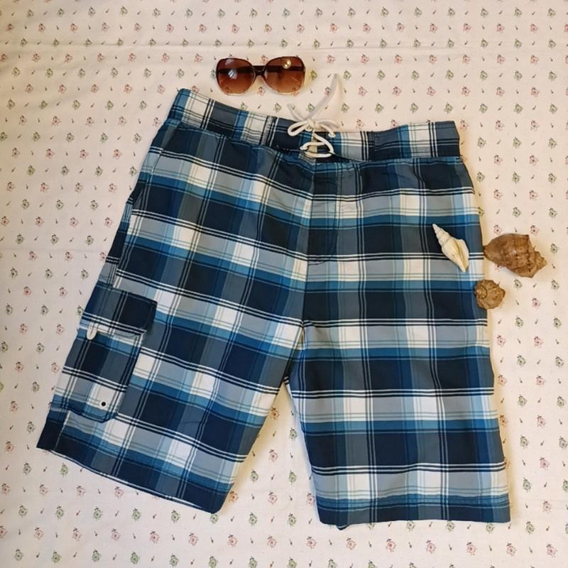 Шорти чоловічі пляжні в клітинку. Розмір L. ПОТ 44, ПОБ 59, довжина 56. на поясі ззаду резинка, шнурок тільки спереду. Всередині сітчаста підкладка плавками. Є дві кишені зовні та одна всередині