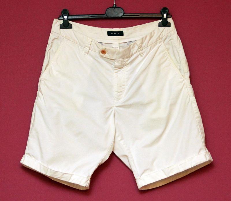 Пара шорт от Gant, хлопковое сукно с добавлением 3% эластина. Минеральные пуговицы, фурнитура YKK, держак с оттиском бренда Gant. Передние карманы брючного типа, задние же садятся на пуговку. Молния застёгивается на пуговку и крючок. Выстрочка лого сделана синтетической нитью в тон над правым задним карманом. Полу Обхват Талии - 42 Длинна - 45 Выход - 27