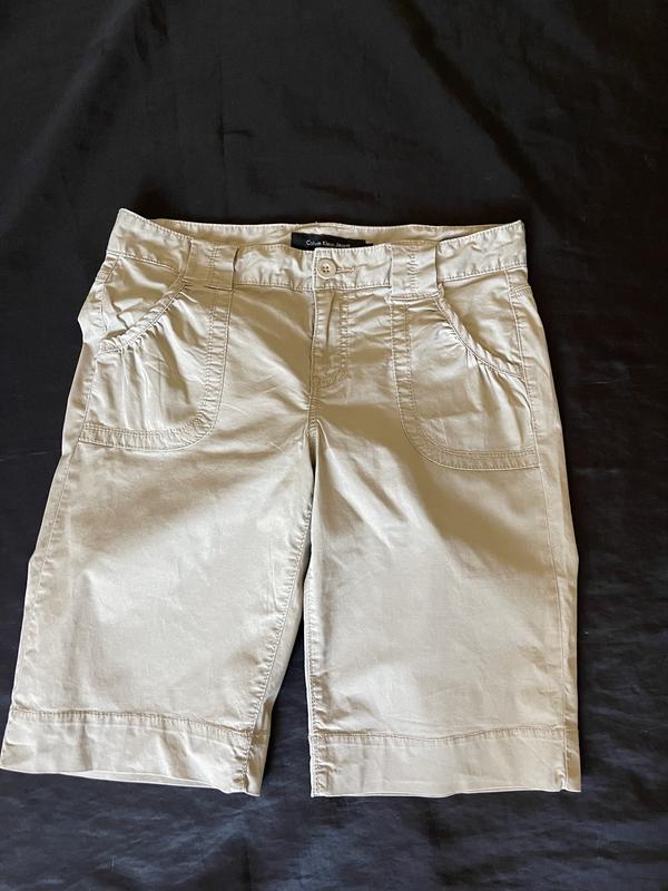 Шорты цвета кэмэл, Calvin Klein. Размер 10. Пояс 43 см, ПОС 50 см, посадка 24/38 см, длина по внешнему шву 54 см, по внутреннему - 30 см, ширина 25 см снизу, 29 см сверху. Стан идеален, стирала 1 раз. Застежка на мужскую сторону, унисекс.