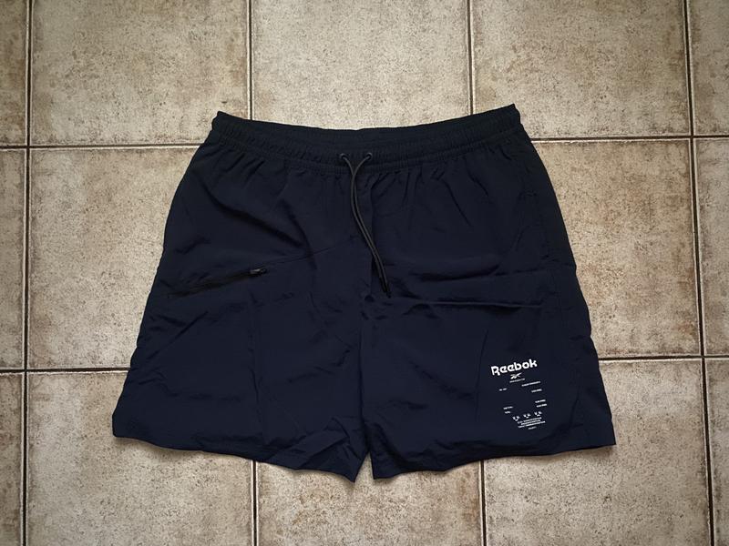 фирменные трекинговые шорты Reebok(England)спортивный крой, размер XL, цвет темно синий, материал технологичный полиэстер, 2 боковых скрытых кармана 1 набедренный на молнии, на штанине фирменный логотип Reebok, состояние новые