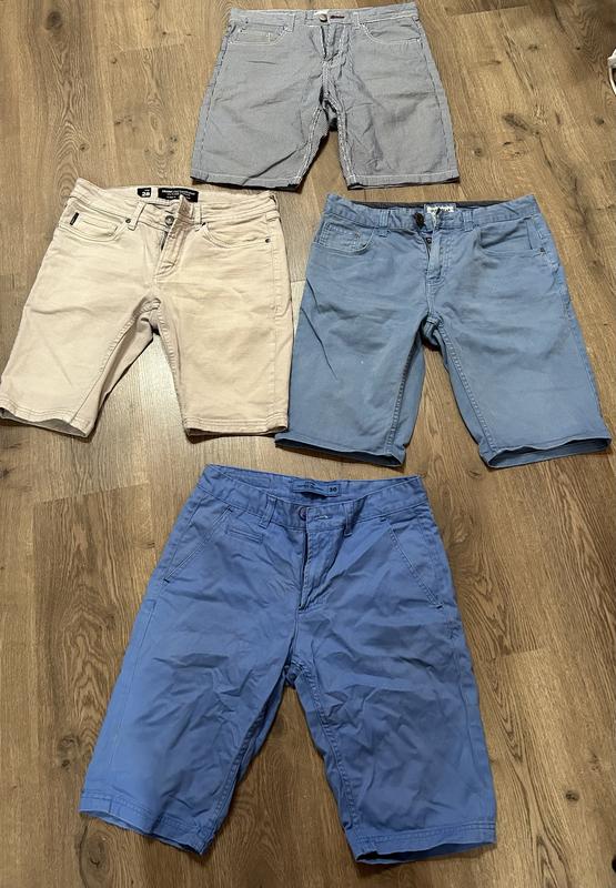 Продам 4 пари літніх чоловічих шортів брендів Cropp, Reserved, Pull&Bear. Розмір S - M. Ціна вказана за всі разом. Виготовлені з котону та еластану. В хорошому стані. Є незначні сліди носіння. Пишіть, будь ласка. Відповім на всі запитання. Детальні заміри: Бежеві Cropp Зовнішній шов - 50 см Внутрішній шов - 28 см Напівобхват поясу- 41 см Напівобхват стегон - 49 см Ширина штанини в найширшій частині- 28 см Ширина штанини внизу - 19 см Передня посадка - 23 см Задня посадка 38 см Сині Cropр Зовнішній шов - 53 см Внутрішній шов - 30 см Напівобхват поясу- 37 см Напівобхват бедер - 52 см Ширина штанини в найширшій частині- 28 см Ширина штанини внизу - 20 см Передня посадка - 24 см Задня посадка - 39 см Блакитні Pull&Bear: Зовнішній шов - 53 см Внутрішній шов - 30 см Напівобхват поясу- 40 см Напівобхват бедер - 53 см Ширина штанини в найширшій частині- 30 см Ширина штанини внизу - 22,5 см Передня посадка - 26 см Задня посадка 38 см В смужку Reserved: Зовнішній шов - 49 см Внутрішній шов - 27 см Напівобхват поясу- 41 см Напівобхват бедер - 54 см Ширина штанини в найширшій частині- 30 см Ширина штанини внизу - 23 см Передня посадка - 25 см Задня посадка 37 см