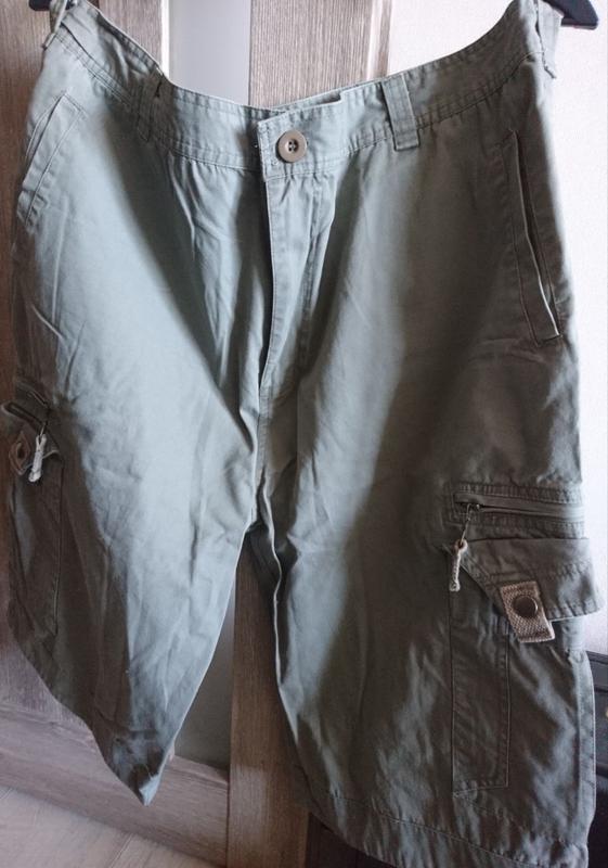 Пара шорт примерно одного размера -38R, зелёно-оливковые. Плотная, но мягкая износостойкая ткань, карманы на кнопках, на одних чуть есть поленялость, но это их не портит.