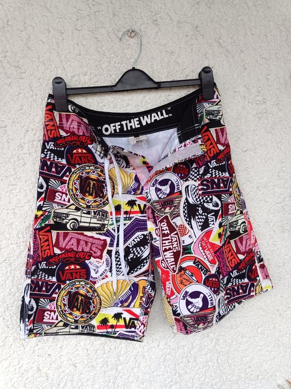 Размер указан 32. Подойдут на S или М. Сровняйте по замерам. Замеры: длина 52, пояс 38, бедра 52, ширина штанины внизу 29. Стан как новые. Материя не растягивается. Стильные шорты для мужчин с ярким принтом. Многоцветные стикеры добавляют оригинальности. Идеальный выбор для летнего отдыха.
