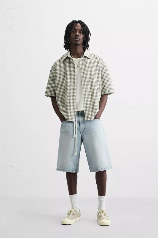 Розмір 40 Бермуди вільного крою, виготовлені з бавовняного деніму. П'ять кишень. Ефект потертості. Застібка спереду на блискавку та ґудзик.
