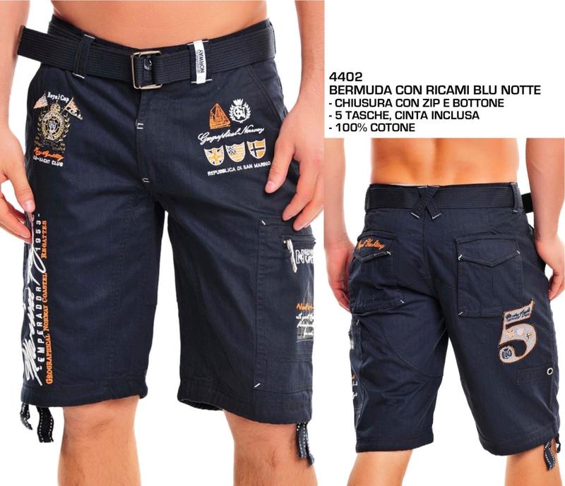 Ці чоловічі шорти-бермуди моделі Parodi від бренду Geographical Norway виготовлені зі 100% бавовни та мають численні декоративні нашивки та вишивки.