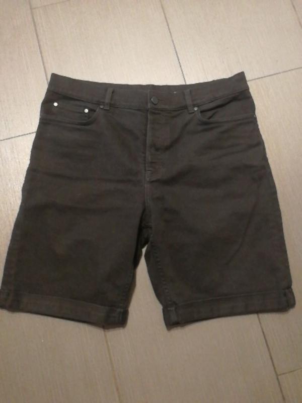Шорти з щільного катона, застібка на гудзики - клепки, розмір 32. ПІТ 45, ПОБІДИ 57, довжина 48, посадка спереду 26 ззаду 36. Колір темно чорний