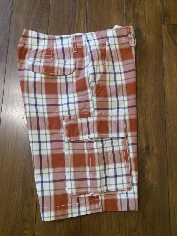 Качественные хлопковые шорты в клетку . Длина 58 см, пот 48 см ,поб 59 см ,низ штанины 31 см . Размер 34