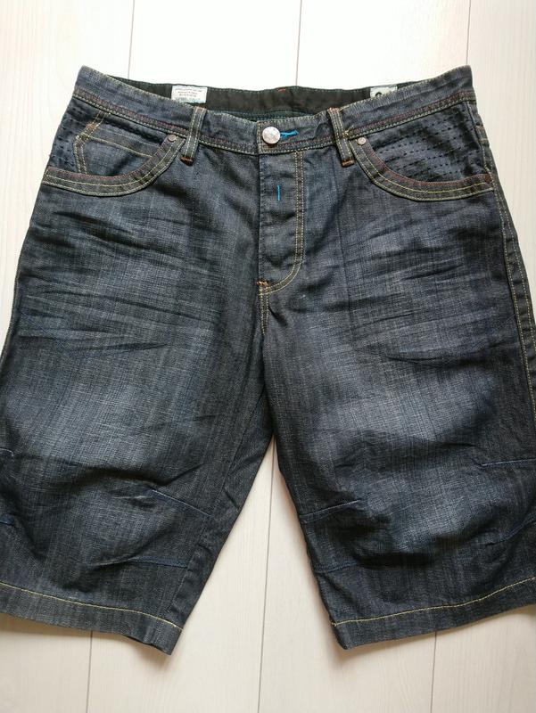 Джинсові шорти в дуже хорошому стані Матеріал котон На болтах Розмір 34 Довжина 59 см Півобсяг пояса 44-46 см Півобсяг бедер 59 см Внутрішній шов штанки 34 см