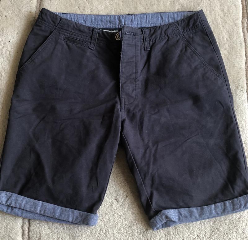 Легкие летние шорты, из плотной хлопковой ткани, темно-синего цвета. 100 % хлопок. Застежка на пуговицах, стилизованных под дерево. В поясе отделаны стильно тонким темно-голубым джинсом и внутри карманы из декоративного ситца ( см. фото).. По бокам косые карманы. Фасон slim fit, то есть по ноге и заужены к нижнему шву, внизу узкий манжет-подворот из тонкого темно-голубого джинса, как отделка на поясе. Полуобхват в поясе-40,5 см, длина штанины по боковому шву-48 см, ширина штанины понизу-23 см.