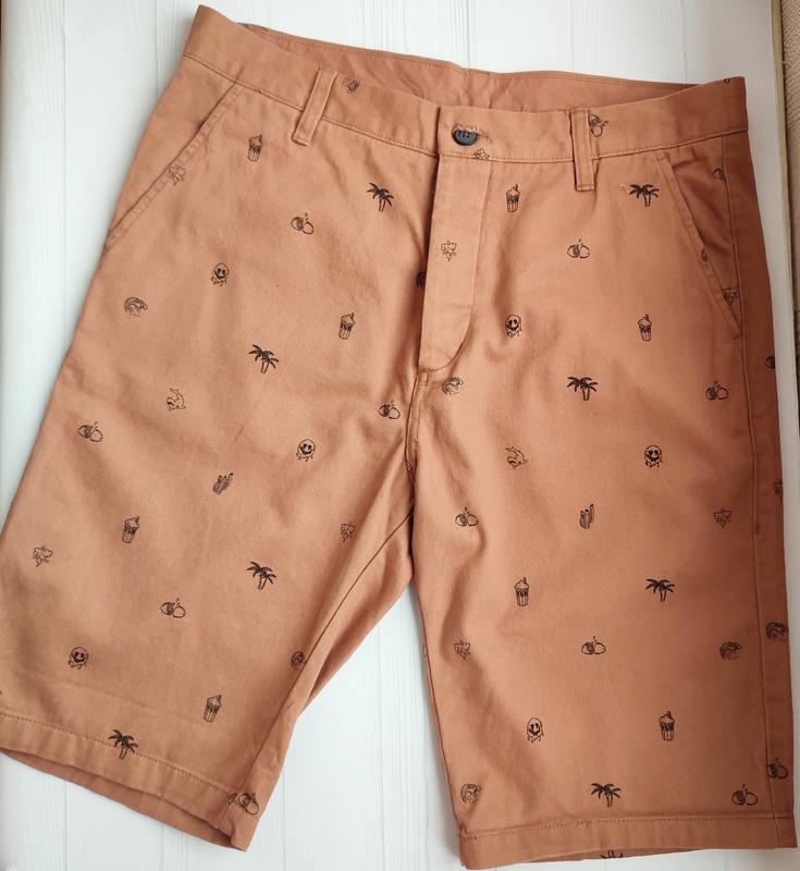 H&M. Шведский бренд. Шорты чиносы с принтом. По бокам карманы, сзади прорезные карманы. Коттон 100% Размер L Длина 56см ПОТ 44см ПОБ 55,5см