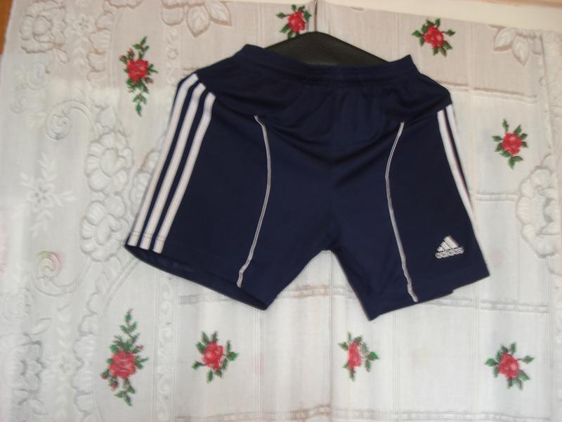Шикарные,фирменные,стильные шорты темно-синего цвета,на поясе широкая резинка,объем в поясе-58см.,хорошо тянутся,впереди под поясом вставки из сеточки,по бокам по три вертикальных белых полоски,на левой штанине-эмблема фирмы,посадка впереди-28см.,сзади-34см.,длина по боку-37см.