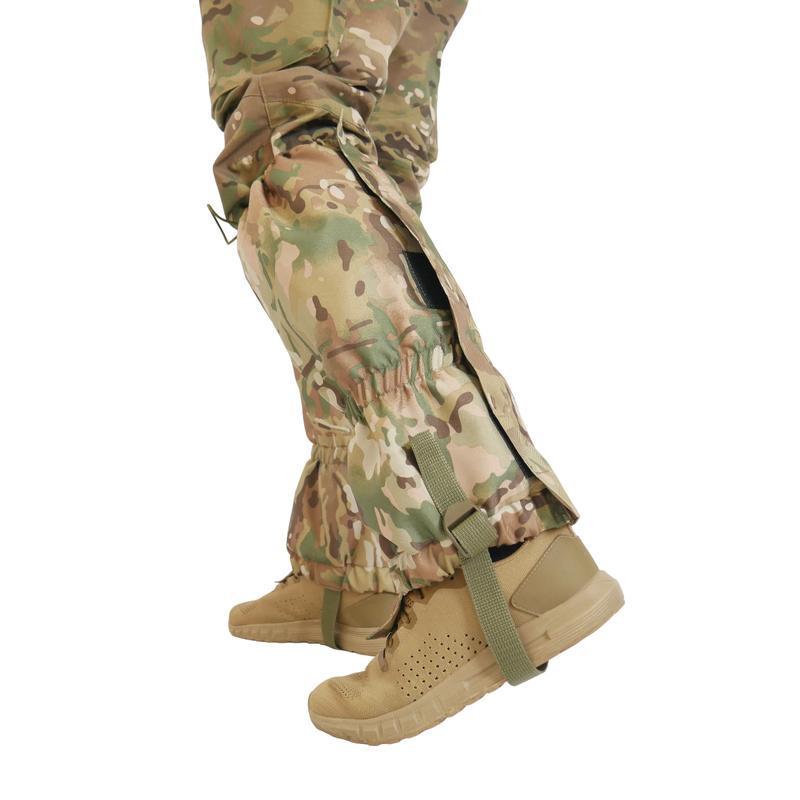 Кілька примірників у наявності Для захисту ніг від вологи, снігу, бруду! Це високоякісний елемент військового спорядження, який захищає ноги від намокання, забруднення та надає додатковий тепловий бар’єр, що зменшує ризик перемерзання та обвітрення кінцівок. Гамаші також запобігають передчасному зносу військового одягу та взуття, зберігає естетичний вигляд тактичного одягу . Закривають ногу від щиколотки до коліна, що не заважає використовувати наколінники. Вони не мають підошви, а одягаються безпосередньо на тактичне взуття поверх штанів. Анатомічний крій надає зручності у використанні та не псує зовнішній естетичний вид. В пошитті використовується щільна водонепроникна тканина Оксфорд 600D (230 г\м2) Внутрішня частина прошита підкладом. Нижня частина гамаш фіксується до шнуровки взуття спеціальним металевим гачком, що дозволяє надійно утримувати гамаші від можливого підняття, перекручування на нозі, стікання води чи бруду у взуття. Ззаду бахіли застібаються за допомоги блискавки, яка додатково прикрита клапаном. Клапан застібається на 3 липучки, що дає можливість швидко одягти і надійно тримати гамаші на нозі під час усього використання. В самому низу розташована стропа-застібка для кріплення під підошву взуття. У верхній частині також наявний штурок – резинка з фіксатором для регулювання під обхват різний ноги. розмір: .