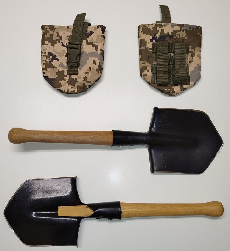 Кілька примірників у наявності Розміри: довжина загальна 49 см; довжина сталевого лотку 17 см; ширина сталевого лотка 15 см. Конструкційна ресорно-пружинна сталь 65Г має відмінні ріжучі та рублячі властивості, дуже добре тримає заточку. Лопата покрита антикорозійною фарбою. Чохол кольору піксель у комплекті. Під замовлення можна зробити іншого кольору. Кріплення чохлу до іншого спорядження за допомогою системи MOLLE.