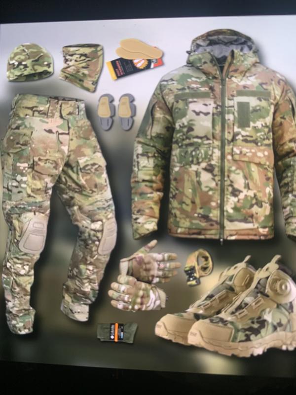 Матеріал: RIP-STOP Склад комплекту: - куртка Soft-Shell на флісі - штани штурмові Gen 3 - шкарпетки Columbia Termo - шапка фліс тактична - баф фліс тактичний - перчатки з кісточками - черевики Esdy автошнурівка - устілки з підігрівом хімічні - ремінь кобра поясний.