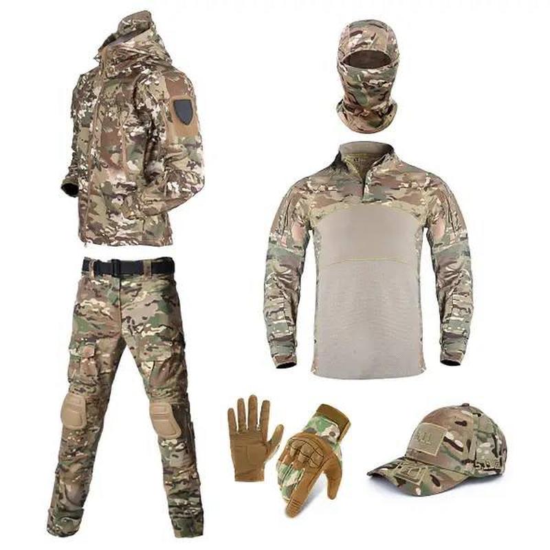 Куртка Soft Shell изготовлена из межслойной полиуретановой мембраны, которая защищает от непогоды. Внутри тонкий флис, что делает куртку теплее. Особенности куртки: Одежда высыхает прямо в процессе носки, не охлаждая при этом кожу. Человек не мерзнет; Благодаря внутреннему слою с большим количеством ворсинок, измельчающих испарения, которые выделяет тело, и быстро выводят их на внешний слой; Регулируемые манжеты на запястьях; Прочный внешний материал; Легкий вес; Высокий воротник; Капюшон (с возможностью спрятать); Капюшон сворачивается на шее и фиксируется липучками; Ветрозащитные, водоотталкивающие и грязестойкие свойства. Карманы: 2 плечевых кармана; 1 карман на руке; 2 вертикальных нагрудных кармана; Двойной карман на пояснице. Боевая рубашка Han Wild Multicam гольф мультикам Материал: Полиэстер / хлопок Цвет: мультикам Аккуратный и практичный убакс, легкая и дышащая рубашка обеспечивает отличный комфорт и свободу движений. Молния 1/4 спереди; Подходит для весны, лета, осени и зимы; На рукавах есть карманы для рук и места для шевронов с личными данными или знаков подразделения; Прочные предплечья, манжеты с регулировкой на липучке; Прочный и износостойкий, плотно сплетенный хлопок с эластичными волокнами, устойчив к разрывам; Тактический дизайн, карман на молнии с быстрым доступом на плече; Липучка + скрытый карман, оснащенный карманом на молнии на обеих руках, практически и удобно для ношения мелочей; Утолщенная фиксация для эффективной защиты локтевого сустава. Брюки Han Wild G2 со вставными наколенниками мультиками Тактические брюки с наколенниками Han Wild мультикам - материал: 50% полиэстер, 50% хлопок, устойчивый к царапинам, дышащий, износостойкий на коленях. Особенности: дизайн с многочисленными карманами и наколенниками, тактические брюки с регулируемой липучкой на талии, коленях и лодыжках. Тактическая бейсболка мультикам: Материал: рип-стоп Размер: универсальный (диаметр головы: 55-60 см) Регулируемый фиксатор сзади Балаклава мультикам Wargame: Материал: смесь хлопка Размер: длина - 35 см, окружность - 44 см Рукавички Mechanix M-Pact 3 мультикам: Материал: эластичный дышащий материал, кожа, термопластичная резина Защита от ударов и травм На выбор: с пальцами или без