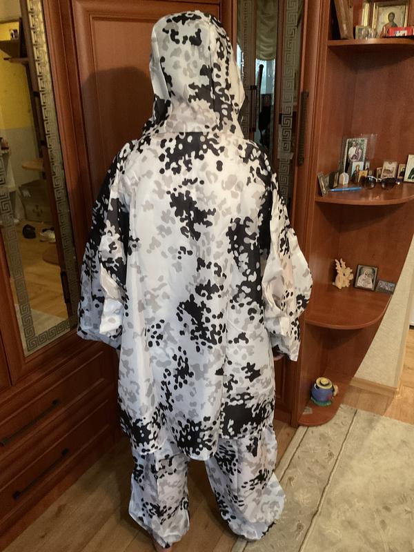 Маскирующий костюм Клякса Ткань оптимально не шуршит и достаточно вынослива для длительного использования. Надевается поверх зимней одежды, для маскировки. Не блестит на солнце. Не шуршит на морозе. Изготавливается из бязи с водоотталкивающей пропиткой. Цвет: белый, ляпка Комплект: куртка и штаны Особенности модели: куртка с молнией и прорези для доступа к карманам зимней одежды. Капюшон стягивается шнуром с фиксатором. Резинка по поясу и низу брюк. Упаковка в чехол.