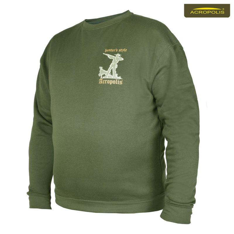 Матеріал: поліестер - 65%, бавовна - 35%. Розмір: S, M, L, XL, 2XL. Чоловічий светр кольору хакі для мисливця з логотипом "hunter`s style". Маскувальний оливковий колір допомагає сховатися в лісі чи на поляні під час літнього полювання. Светр демісезонний. Носять як сам, так і під верхнім одягом - курткою, плащем, дощовиком. Матеріал - комбінований. Поєднує натуральну бавовну (для підтримки тепла) та поліестер (забезпечує презентабельний вигляд після прання). Кофта чоловіча на довгий рукав. Носять поверх поло або сорочки восени чи весною. Добре пропускає повітря. Крій достатньо зручний, не сковує рухів під час заганяння звіра чи готування їжі, складання палаток або облаштування побуту на природі. Низ виробу і рукавів оброблений гумкою, щоб светр не підстакував і міцно тримався на людині. Горловина - заокруглена, комфортна, не стискає горло. На передній частині кофри - стилізований малюнок мисливця з рушницею і мисливською собакою. Купують такі светри чоловікам, які захоплюються полюванням, телевізійними каналами про життя тварин, полюбляють проводити час в лісі чи в горах. Одягають також в повсякденному житті під спортивні та джинсові штани. Адже чоловічі светри Акрополіс прекрасно впишуться як в класичний гардероб, так і стиль casual.