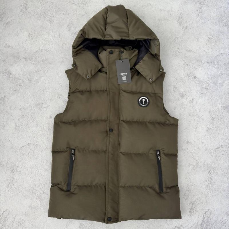 Жилет TRAPSTAR Колір: чорний, хакі Виробництво: Туреччина Матеріал: високоякісна не продувна плащівка💨 Дві зовнішні кишені на блискавці, одна внутрішня, комірець стійка, капюшон на блискавці Логотипи: вишивка та нашивка Розмір: S, M, L, XL, XXL