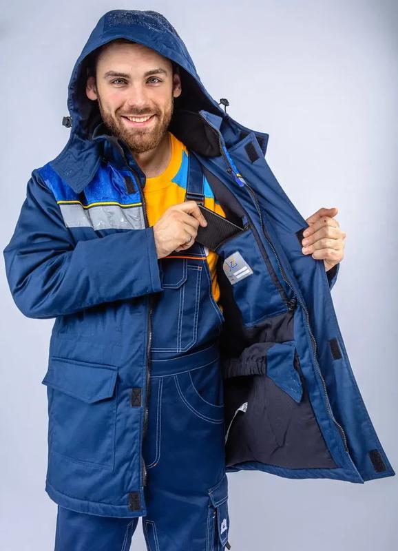Куртка рабочая утепленная зимняя EVEREST ANTISTAT (спецодежда). Куртка рабочая, утепленная с повышенным ресурсом эксплуатации, обеспечивает защиту от холода, механических повреждений и промышленных загрязнений. За счет использования антистатических и сверхпрочных тканей и наличие сигнальных лент, Куртка рабочая EVEREST ANTISTAT рекомендована к использованию для различных профессий. Модель EVEREST ANTISTAT разработана с учетом пожеланий наших клиентов и требований по охране труда различных отраслей: - от пониженных температур 3 и 4-го климатического пояса - сигнальная одежда повышенной видимости - от масел, воды и ОПЗ. - статического эл. заряда - механических повреждений Стандарты сертификации: 29335-92, 29338-92, ДСТУ IS**********, 12.4.124-83, ДСТУ EN 340:2013, ДСТУ EN 1149-1:2003, ДСТУ EN 471-2001. Куртка EVEREST ANTISTAT с центральной бортовой застежкой на молнии имеет ветрозащитную утепленную планку на липах. Два объемных кармана с клапанами и один внутренний карман для телефона и документов на молнии размером 18смХ20см, делают курточку не просто комфортной, но и практичной. - Куртка регулируется по линии талии кулисой и имеет внутренний клапан на резинке для защиты от продувки поясницы. - Фигурная линия низа куртки обеспечивает свободу движения в работе и при этом надежно защищает всю поверхность ниже поясницы от продувания. - Воротник «стойка» дополнительно утеплен филсом, обеспечивающим комфорт при длительной эксплуатации и защищающий шею от ветра и холода. - Съемный капюшон на утепленной подкладке регулируется в объеме, что дает возможность эксплуатации, как с защитной каской, так и без. - Рукава оборудованы трикотажными манжетами, для блокировки задувания ветром. Для повышенной видимости Куртка EVEREST ANTISTAT оснащена свето-возвращающими лентами 5см ширенной на спине и груди. Вся фурнитура выполнена из 100% нейлона, что гарантирует Куртке EVEREST ANTISTAT высокий ресурс эксплуатации. Куртка EVEREST ANTISTAT сшита нитками ТМ ZUKI. Материал верха: сверхпрочная, водоотталкивающая, антистатическая ткань ProCott, исключает образование статического электричества в процессе эксплуатации. Ткань ProCott армирована карбоновой нитью, что обеспечивает высокую защиту от механических воздействий. Высокотехнологичная пропитка ткани гарантирует отталкивание различных загрязнений и жидкостей. Состав 60%, хлопок 39%, ПЭ 1% карбон, пл. 250г/м2, пропитка д.е. Утеплитель: Hollowsoft -- современный материал изготовлен по передовой европейской технологии гарантирует защиту от холода до -35С. Hollowsoft имеет запаянную поверхность с двух сторон и отличную формоустойчивость. Материал быстро восстанавливает первоначальный объем, даже после многократных стирок. Куртка благодаря утеплителю Hollowsoft хорошо вентилируется при активном движении и не удерживает влагу, а так же исключает миграцию волокон даже при длительной эксплуатации. Подложка: 100% хлопок, плотность 140 г/м2 обеспечивает максимальный комфорт при прилегании к телу и минимизирует образование статического электричества.