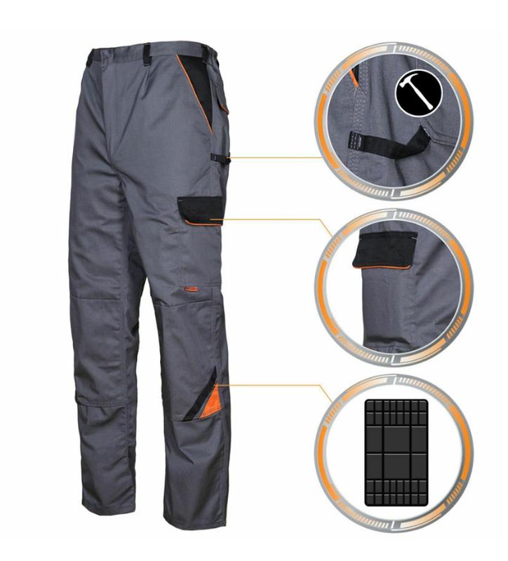 Брюки с профессиональной талией исключительно привлекательного дизайна и отличной функциональности Изготовлен из очень прочной специализированной ткани 65% полиэстера и 35% хлопка с очень высокой плотностью 320 +/- 10 грамм / 1 м 2 и прочным, плотным переплетением. Характерная черта: - профессиональный шитье и эстетика исполнения - тройные и двойные швы, а также многочисленные сплошные закрепки, дополнительно укрепляющие места, особенно подверженные разрыву - 5 карманов, дополнительный усиленный карман для линейки - усиление на задних карманах - 2 пришитых кармана для наколенников, позволяющих использовать сменные наколенники - эластичный пояс - очень низкая усадка даже после многократной стирки - стабильность цвета