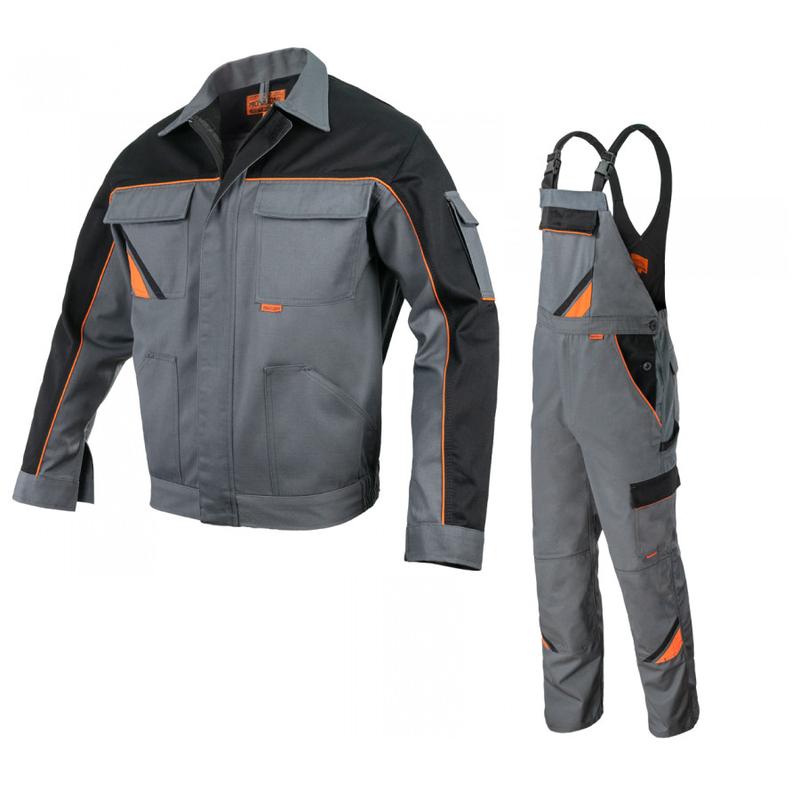Костюм рабочий Professional Grey: Изготовлена из очень прочной специализированной ткани: 65% полиэстера и 35% хлопка с очень высокой плотностью 320 +/- 10 г/м2 и прочным, плотным переплетением. Преимущества полукомбинезона: - Резинка на поясе и нижней части не сковывает движений и подгоняет брюки по фигуре - Ширина регулируется с помощью пуговиц на поясе, а длина с помощью лямок - Большое количество карманов - один на груди, застегивающийся на липучку, два по бокам, два задних кармана на липучках, один карман на штанине для принадлежностей, а также боковой карман на липучке - Дополнительные карманы для наколенников KING BEE - Хлястик для крепления ключей Преимущества куртки: - Рукава застегиваются на липучке, дающие возможность регулировки - Два кармана на груди, застегивающиеся на липучки, а также два боковых кармана - Дополнительный карман на рукаве для мобильного телефона - Система вентиляции под мышками - В нижней части куртки находится стягивающая резинка, защищающая от ветра - Дополнительные вставки из специальной ткани на спине, увеличивающие комфорт использования Цвет: серый с черными и оранжевыми вставками