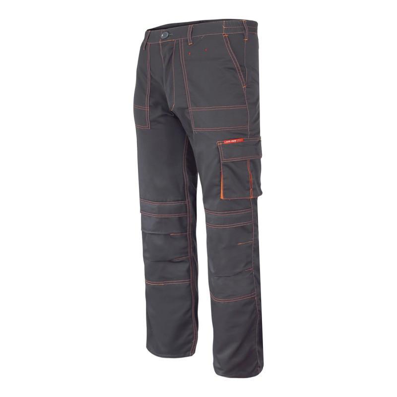 Щільність тканини: 245 г/м. кв Матеріал: 35% Бавовна, 65% Поліестер Кількість кишень: 5 шт Упаковка: поліетиленовий пакет Темно-сині захисні робочі штани вільного крою з контрастними помаранчевими подвійними швами і помаранчевими підкладками кишень. Зшиті з бавовни та поліестеру. Ширина в поясі регулюється гумкою. Тут передбачені тримачі для ключів. Виріб має 5 кишень (два на липучці). На ногах є кишені для наколінників (закриваються липучкою). Пришивка з ідентифікатором.