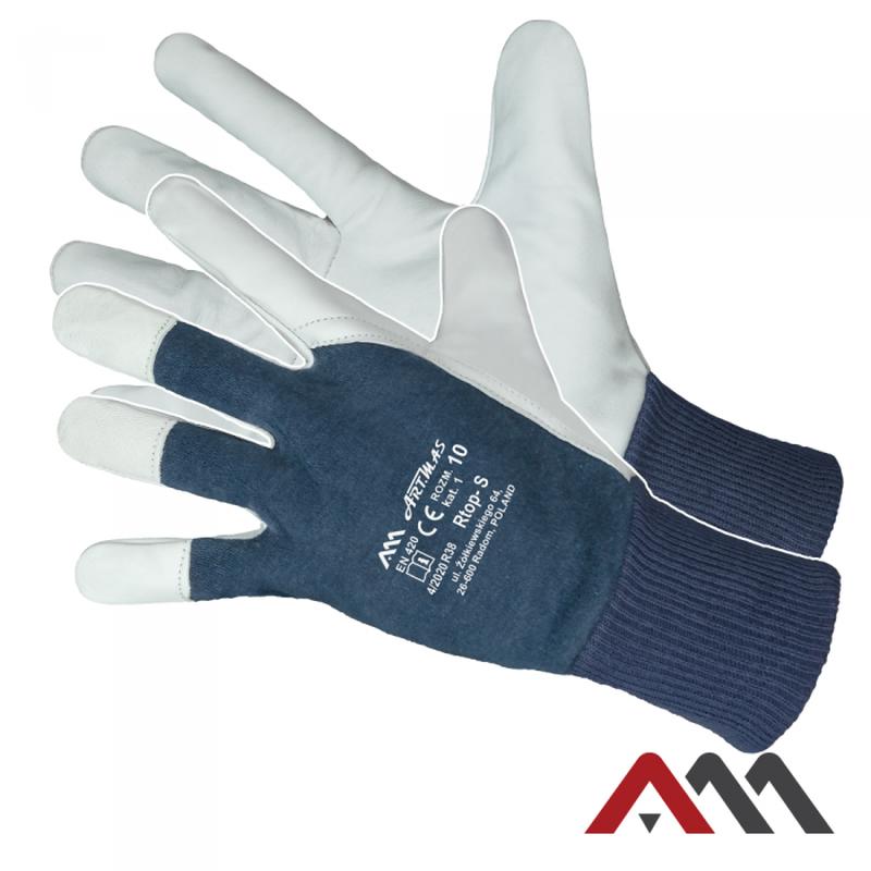 ### Захисні рукавички, посилені м'якою козячою шкірою, еластичним темно-синім трикотажем на спинній частині, обробленим ранцем. Робоча частина з одного шматка шкіри, зовнішня частина з еластичної тканини темно-синього кольору, краще прилягання рукавички до руки, захист рук від проникнення пилу, вологих брудних речовин, проникнення холоду та снігу, вказівний палець безшовний ззовні.