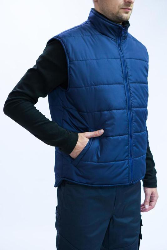 Жилет мужской утепленный Эксперт Ткань верха - ткань плащевая Дюспо милки, 85г/м2 с водоотталкивающими свойствами. Подкладка - ткань подкладочная 100%ПЭ. Утеплитель - синтепон 200г/м2. Жилет прямого силуэта с удлиненной спинкой, центральной застежкой на текстильную тесьму молнию, воротником стойкой - внутренний воротник из флиса. Полочки с нижними прорезными карманами и внутренним накладным карманом на подкладке. Жилет выстеган горизонтальными строчками.