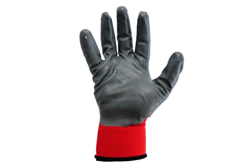 Перчатки трикотажные бесшовные с нитриловым покрытием ладони (красно-серые). Ткань: Полиэстер,13 класс вязки (13 петель на 1 дюйм). Высокая устойчивость к разрывам и проколам, эластичны даже при низких температурах. Применяются в домашнем хозяйстве, саду и мастерских. Подходят для защиты от воздействия различных масел, смазок и растворителей.