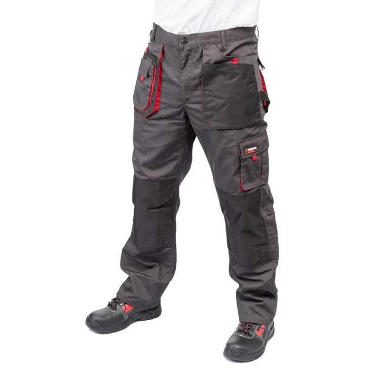 Робочі брюки темно-сірого кольору виготовлені з міцної тканини: 80% поліестер і 20% бавовна зі щільністю 260 г/м². Наявність великої кількості кишень дозволяє розвантажити руки і забезпечує швидкий доступ до підручного інструменту. Продуманий крій для комфортнії роботи Блискавка з вітрозахисним клапаном Накладки з чорної тканини для вставки наколінників забезпечують зручність в роботі на твердих поверхнях Широкі петлі для паска