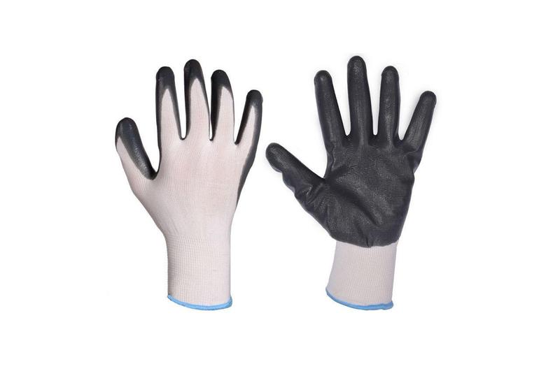 Рукавички трикотажні безшовні з нітриловим покриттям долоні (біло-сірі), 10", 36-38 г. Тканина: Поліестер, 13 клас в'язки (13 петель на 1 дюйм). Висока стійкість до розривів і проколів, еластичні навіть при низьких температурах. Підходять для захисту від впливу різних масел, мастил та розчинників.