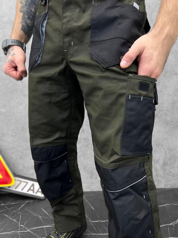 Полукомбинезон пошит из прочного и износостойкого материала, что и куртка с брюками: 80% полиэстер, 20% хлопок с плотностью 260 г/м². Отлично защищают работника от загрязнений и механических повреждений. Множество накладных и прорезных карманов позволяют разгрузить руки мастеру и выполнять работу с удобством и быстрым доступом ко всем инструментам. Особенности: * полукомбинезон прямого кроя с боковыми прочными пуговицами-заклепками * регулируемые лямки с вставкой из эластичной резинки для настройки необходимого размера * 11 функциональных прочных карманов для хранения инструментов и аксессуаров * усиленные швы, выполненные тройной строчкой, повышают прочность * накладки из черной ткани для вставки наколенников обеспечивают удобство в работе на твердых поверхностях