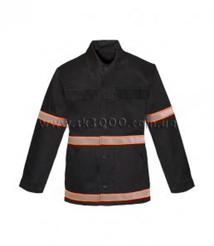 Куртка "Дорожник-2" подовжена з застібкою на гудзиках та рукавами на манжеті з гудзиком. На куртці маємо чотири накладних кишені - дві нагрудних на гудзикахах, з клапанами, та дві нижних накладних. По колу, по низу куртки, та на рукавах на рівні ліктів нашита яскраво-помаранчева стрічка, з світловідбивним напиленням. Тканина: Дефенса. Колір: чорний. Цей виріб призначений для експлуатації працівниками аеропортів, дорожньо-експлуатаційних, будівельних організацій, та служб ЖКГ. Комбінація помаранчевої та чорної тканини, зі світловідбивними смугами, виділяє працівника, з навколішнього середовища та є обов'язковим елементом охорони праці.