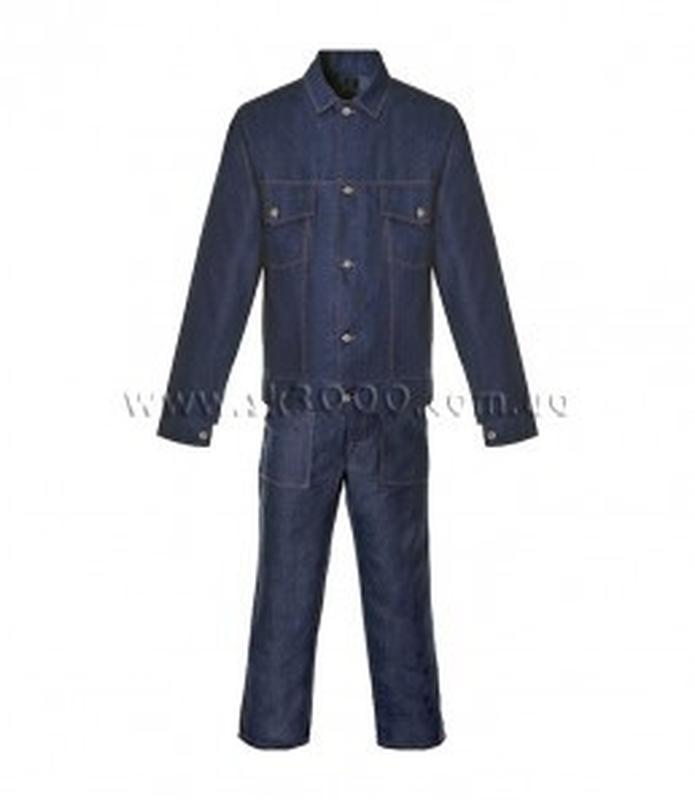 Костюм "ИТР"(куртка+напівкомбінезон) вироблено в дусі класичного джинсового одягу. Коротка куртка, з приточним поясом, на центральній застібці на гудзиках. Полочка та спинка з кокеткою та рельєфами. Рукав з манжетою на гудзику. Відкладний комір. Нагрудні та внутрішні кишені карманы, з клапаном на гудзику, нижні кишені у шві рельєфу. Напівкомбінезон з нагрудником,на якому розташовано нагрудну накладну кишеню, з клапаном на гудзику. Нижні накладні кишені, з вхідом на вскіс. Бретельки з гумкою, застібаються на карабіни. На спинці, в області талії вшита внутрішня гуика. Фурнітура металева. Оздоблювальні шви подвійні, контрастні. Тканина: Джинс. Колір: темно-синій.