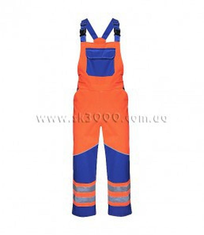 Напівкомбінезон "360в" має нагрудну накладну кишеню з клапаном на липучці та маленькою кишенею у лівому кутку нагрудної кишені. Довжину напівкомбінезона можна регулювати шлейками, при допомозі карабинів та рамок. З боків напівкомбінезон застібається на гудзики. Гульфік на блискавці. Бічні кишені врізні з вхідом на вскіс. Штанини відрізні, на вскіс, вище колін, а в шов вставлений світловідбивний кант. По низу штанини пришито світловідбивну стрічку, у два ряди. Тканина: Дефенса. Колір: волошковий/помаранчевий.