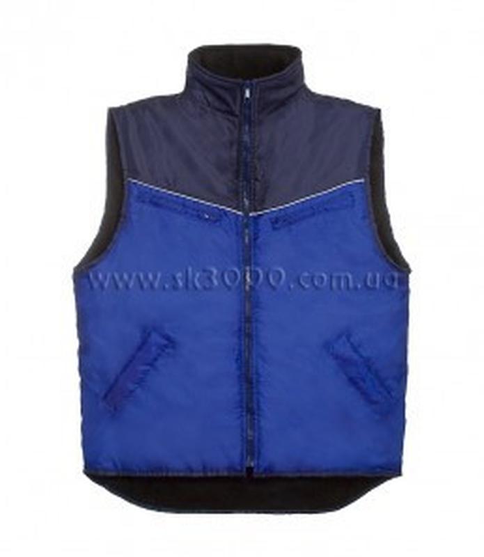 Жилет утеплений "Новатор", прямий, подовжений. Комір стійка. Застібаєтся на блискавку. Спинка та полочка з кокеткою, на яку нашит світловідбивний кант. Спинка має виступ з закругленими краями по низу жилета. Нижні кишені на вскіс, прорізні, в листочку. Кокетка спинки, полочки та комір - темно сині, усі інші деталі - волошкові. Тканина: Оксфорд(100% синтетика, водовідштовхуюче просочення). Колір: темно синій/волошковий. Утеплювач: один шар синтепону. Підкладка: фліс.