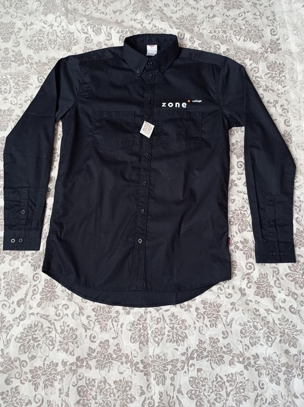 Мужская рубашка. Имеет длинный рукав на манжетах. На груди есть накладные карманы. Аккуратный воротничок с пуговицами. Силуэт прямой. Низ изделия закруглен. Сзади низ закруглен. Есть петелька на шве между лопатками. Есть надпись college zone Состояние новой вещи. Состав: 60%-котон 40%-еластан Ткань тянется, но совсем немножко Замеры: плечо-16 рукав -68 ПОГ-56 ширина снизу -56 длина сбоку -48 длина по пуговицам-73 плечи сзади по шву -46 длина сзади -83