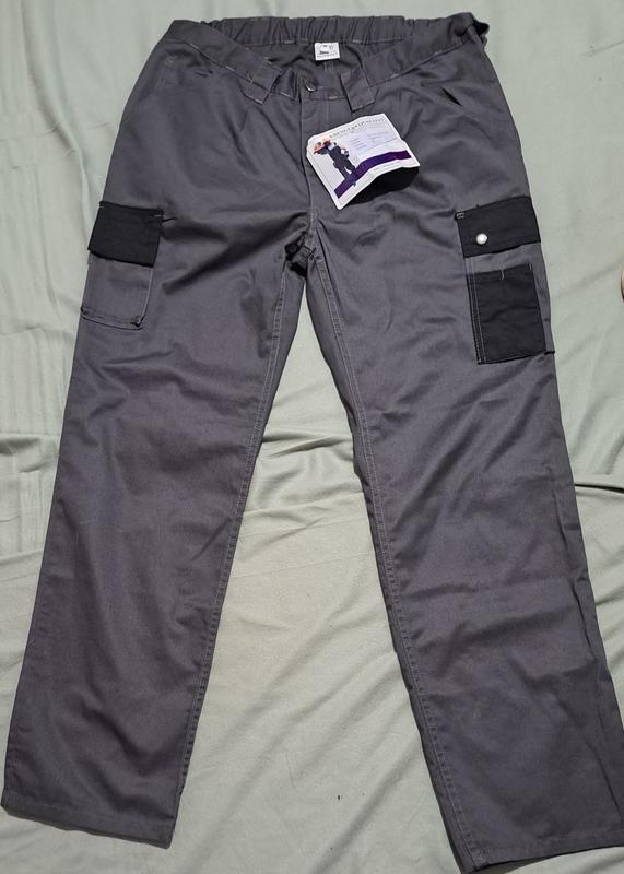 мужские рабочие штаны: серого цвета с черными вставками, в поясе есть резинка, размер 48, состояние новое