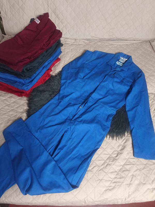 Рабочий комбинезон, сплошной, размер 92T, S-М Длина 169, шаг 78. Бедра 56, пог 54, плечи 46. Плотная ткань, застегивается на кнопках. На брюках боковые глубокие карманы, также большие нагрудные. В поясе резинка. В наличии бордо, красный, серый 2 шт, синий 3шт